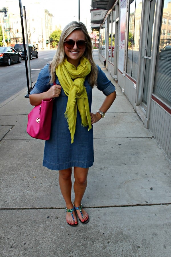 Love that dress so much – I’ve been on the hunt for a great fitting chambray style like this! The yellow scarf is the perfect accessory for this look! 🙂