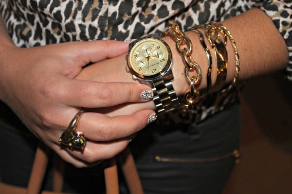 Leopard Shirt: J.Crew // Coated Pants: Zara // Necklace: Bauble Bar // Shoes: Sam Edelman // Bag: J.Crew // Watch: Michael Kors // Bracelets: Spike the Punch, H&M (similar) // Nails: Sally Hansen // Panther Ring: Max & Chloe (identical)