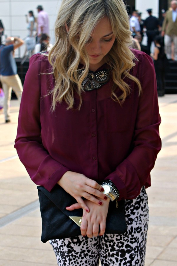 such a great outfit – i love the maroon color with the “snow leopard” pants 🙂 i actually picked them up at J.Crew while they were on sale and they are so comfortable!