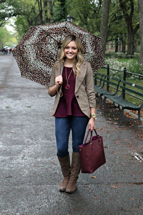 LOVE the peplum in oxblood-ish. Super cute rainy day outfit!