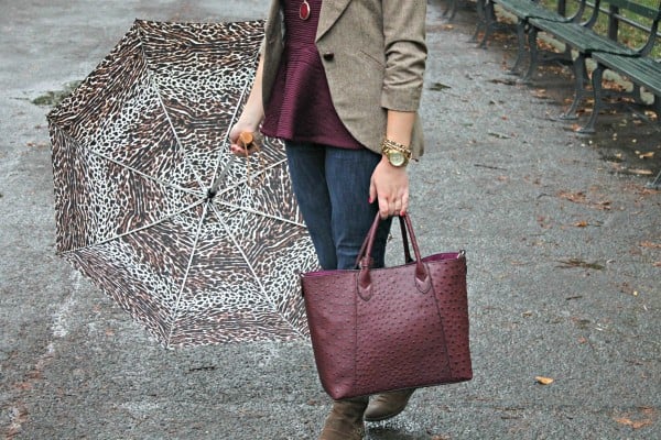 Love your outfit. Who would have thought you could use your umbrella as an accessory. I love it. I adore the rich bordeaux.