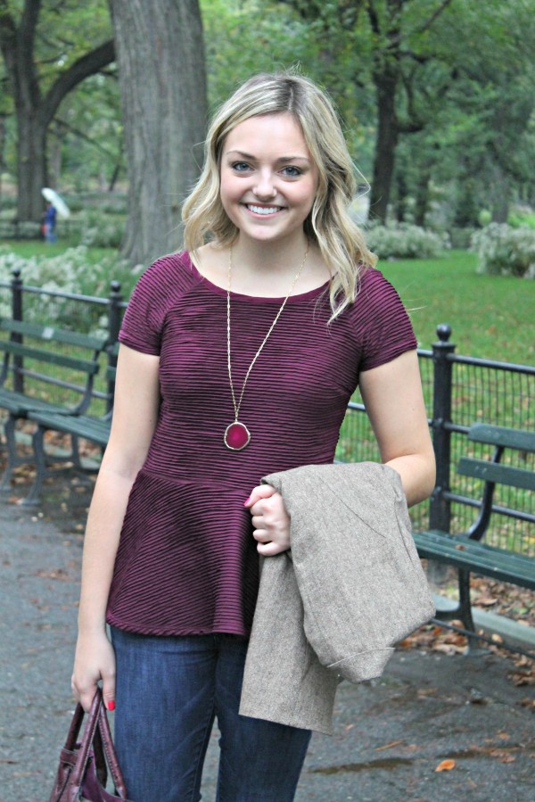 Jessica, this is one thing I love about fall and winter that you can layer clothes and build up your outfit with different textures. Love your tweed blazer and how you incoporated this super feminine bordeaux peplum into it. Great fall look, one of my favourites of you so far 🙂