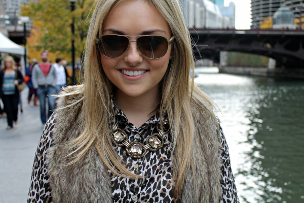 Gap Jacket / Forever 21 Faux Fur Vest (similar) / J.Crew Leopard Shirt / AG Rust Colored Denim / Kelsi Dagger Wedge Booties / J.Crew Leopard Socks (LOVING THESE!) / Bauble Bar Necklace (similar) / Gap Leather Bow Bracelet (similar) / gifted Kristin Hassan Leather Wrist Wrap / gifted Bauble Bar Pyramid Bracelet / Michael Kors Watch / Ralph Lauren Aviators (similar)