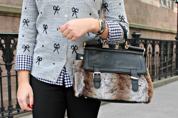 J.Crew Gingham Shirt / J.Crew Sequin Bow Cardigan / Gap Skinny Pants / Frye Boots / gifted JustFab Faux Fur Bag / Burberry Watch / Bauble Bar Bracelet (similar) / Tahari Burgundy Coat