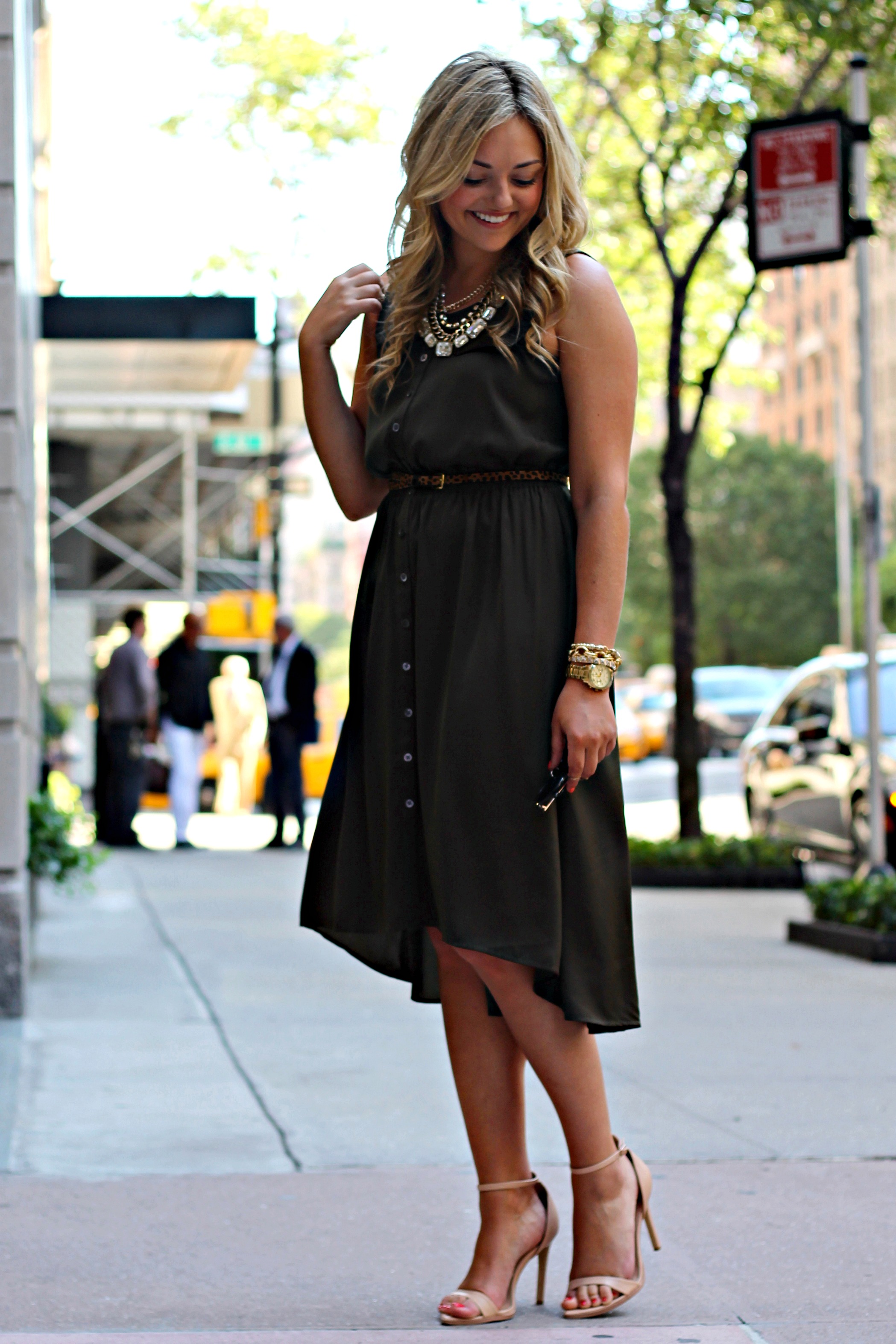 Beautiful outfit! I love the hi/low hem of the dress and army green is definitely your color.