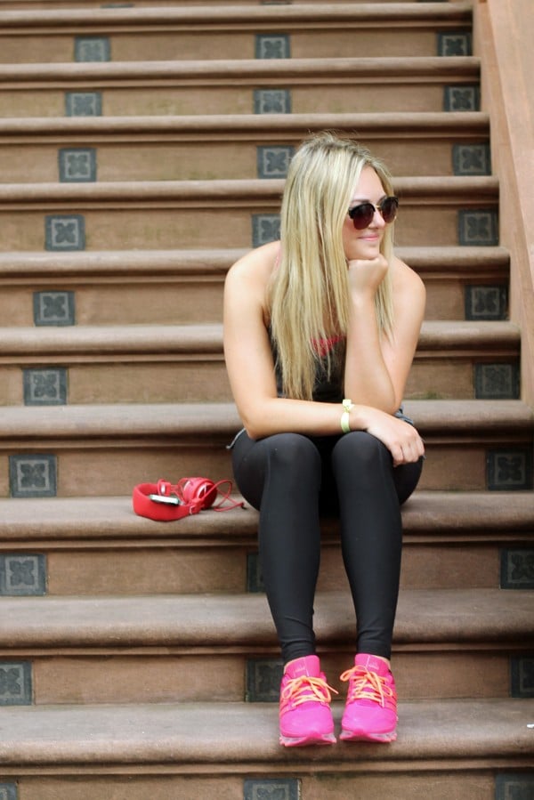 Sitting on the steps of a Grammercy Park brownstone wearing an adidas TechFit tank, bra, & leggings and my adidas Springblade sneakers!