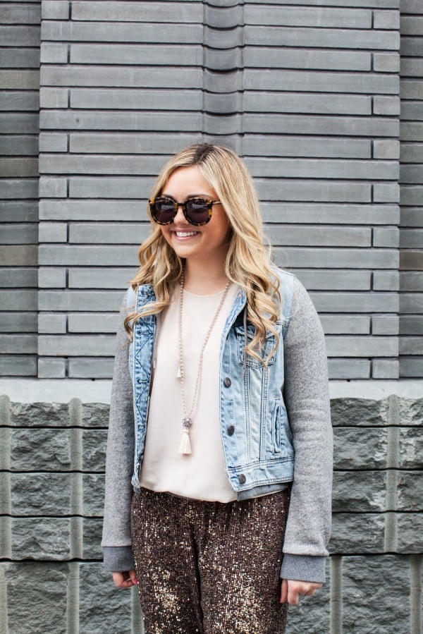 Oh my goodness girl, this look is fabulous!!! I love the sequin pants and how you’ve made them a bit more casual with the denim jacket. Too cute for words!