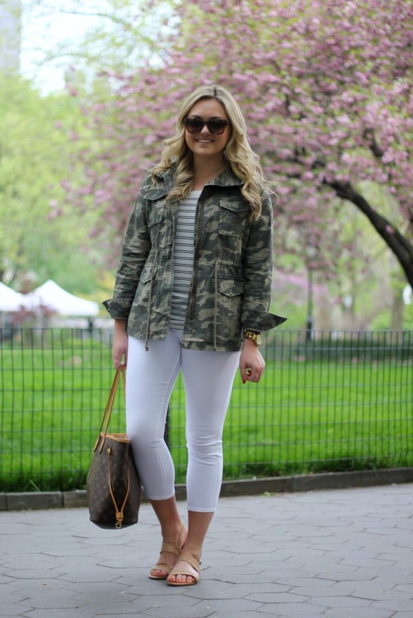 For a more casual weekend look, I used a few of my favorite tricks while I was getting ready … Mixing prints and wearing white on white. I paired my white cropped jeans with a white and blue striped tee and a camo jacket, finished off by a pair of nude sandals.