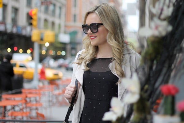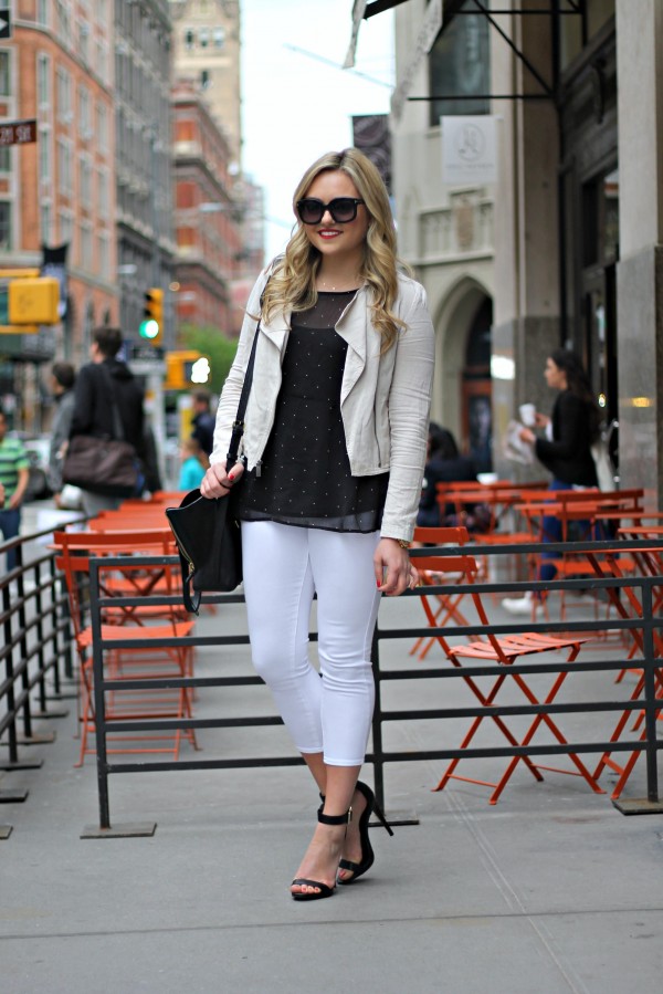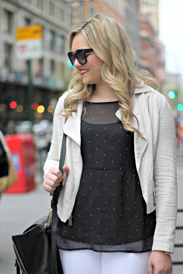 To take the vibe just a bit more dressy, I paired my cropped white jeans with a polka dot chiffon top (love the slight flowy peplum fit) and a linen motorcycle jacket. And when I’m trying to take my look to the next level, red lipstick and a pair of sky-high pumps are pretty much always a good idea. On a side note, this linen moto jacket is so perfect for the summer season ahead. I’m always one for layering and this super lightweight material is going to make spring and summer dressing an absolute breeze. #punintended