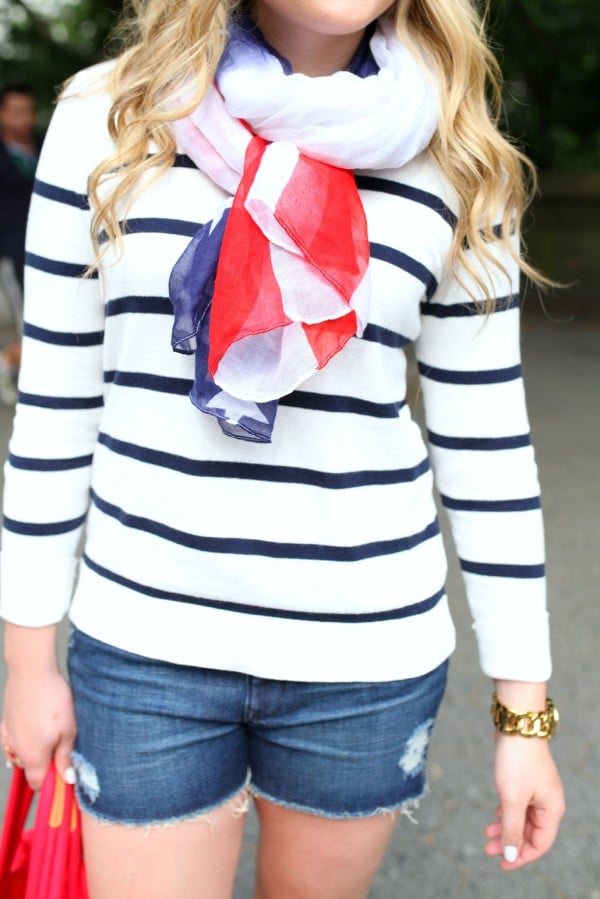Charming Charlie Stars & Stripes Scarf | Old Navy Sweater (similar here & here) | Charming Charlie Anchor Necklace | Gap Shorts | Charming Charlie Striped Flip Flops | Gap Sunglasses (similar) | Charming Charlie Star Ring | MZ Wallace Metro Tote | Michael Kors Chain Link Watch