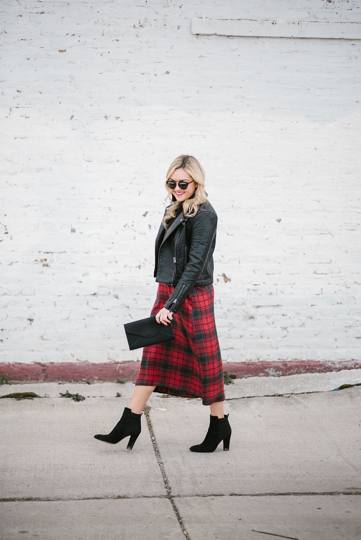 Turtleneck + Plaid Dress + Moto Jacket + Ankle Booties | @bowsandsequins